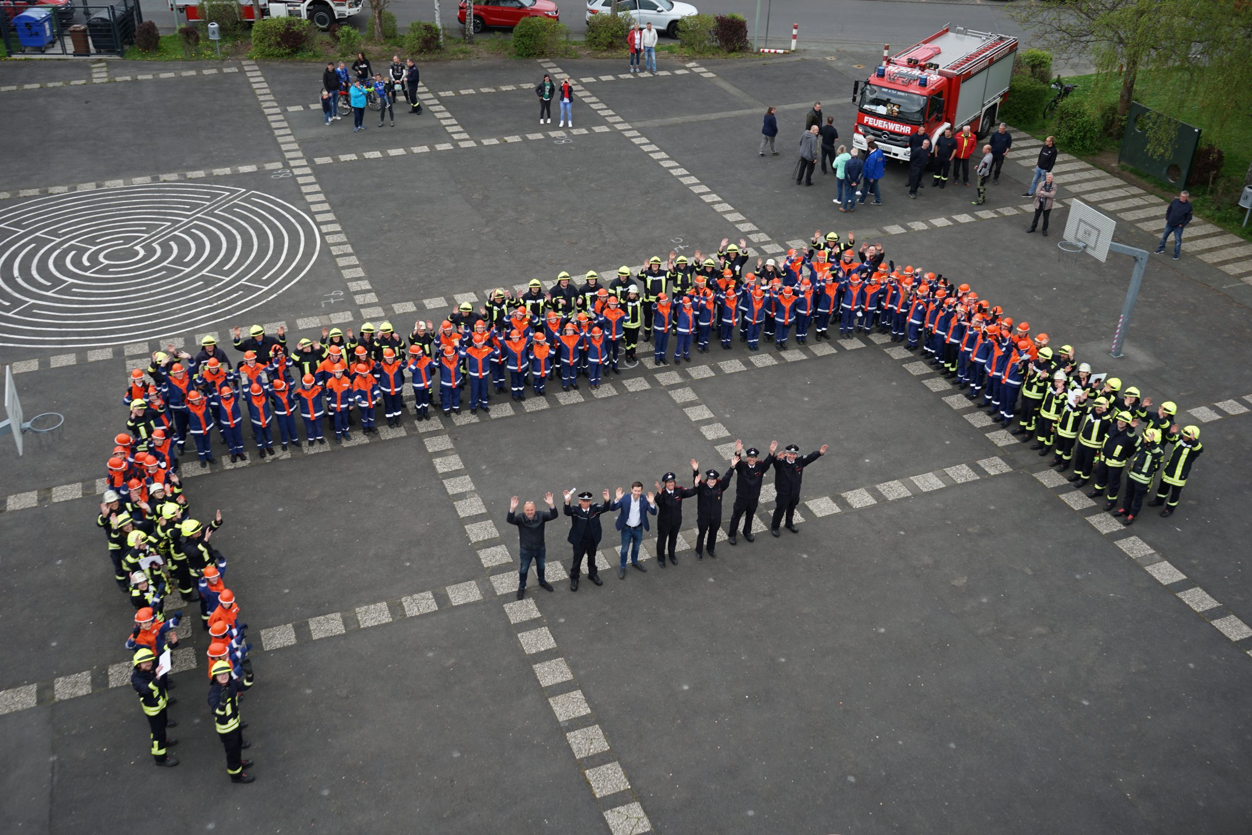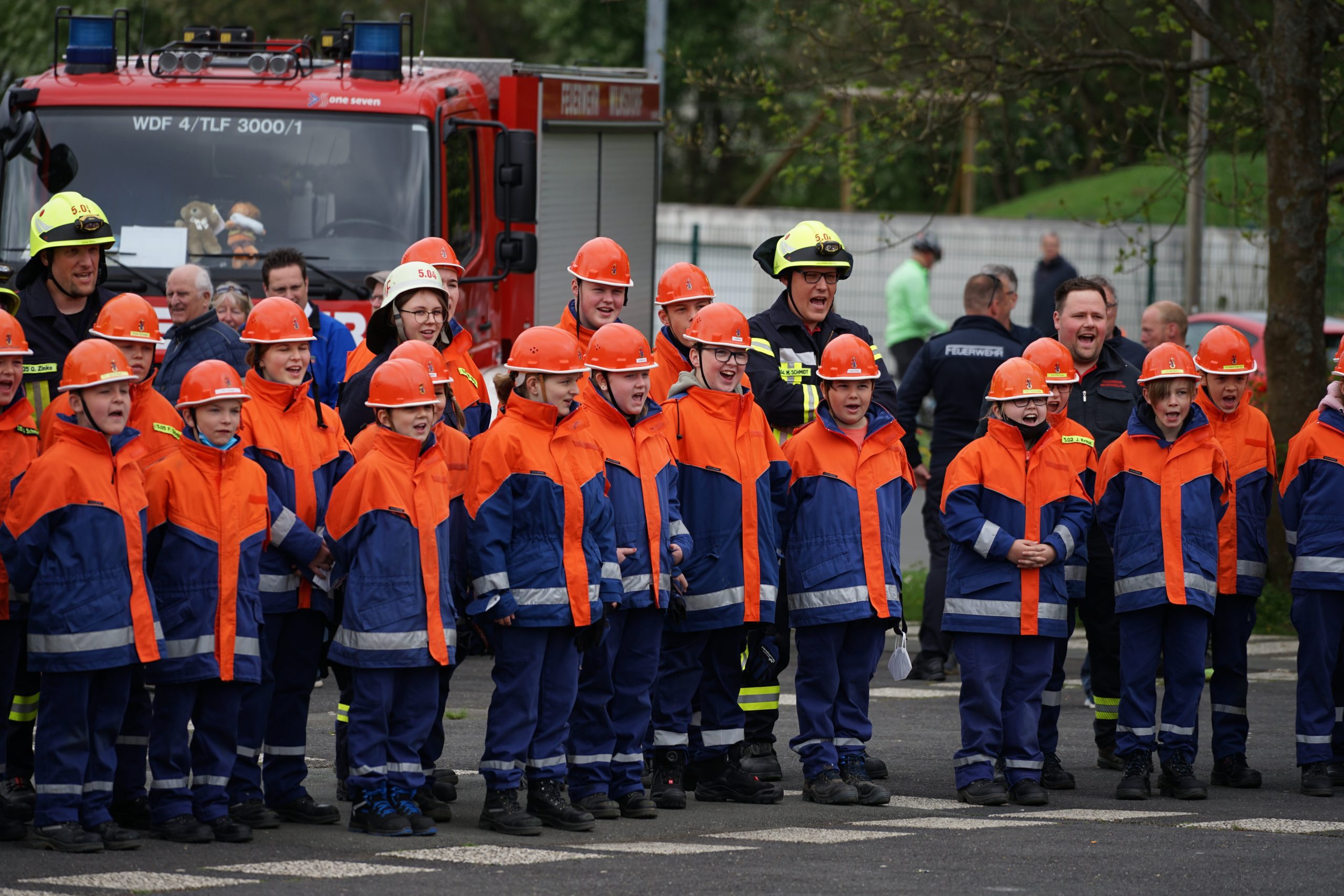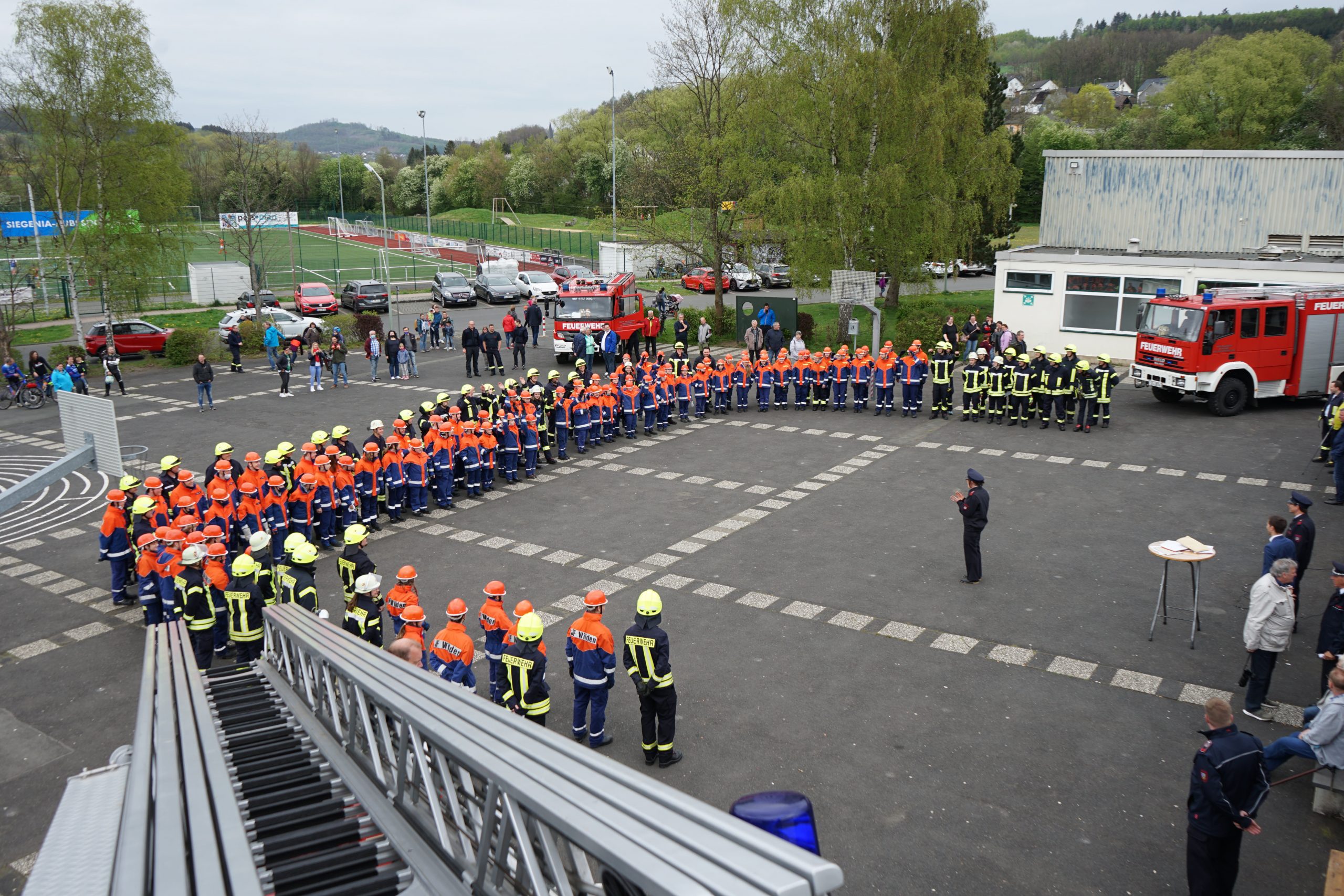 Es war ein imposantes Bild, das sich am Samstagnachmittag (30.04.2022) auf dem Schulhof der Realschule Niederdielfen bot. 141 Mitglieder der 11 Jugendfeuerwehren der Gemeinde Wilnsdorf, akkurat in Formation aufgestellt, trafen sich zur großen gemeinsamen Auftaktübung. Nach der sehr langen Zwangspause durch die Corona-Pandemie war es endlich wieder so weit, und der Feuerwehrnachwuchs durfte der Öffentlichkeit sein in zahlreichen Übungsstunden erlerntes Können demonstrieren. Und die Unterstützung seitens der Bevölkerung war groß – eine Vielzahl an Besuchern begleitete den Nachmittag.