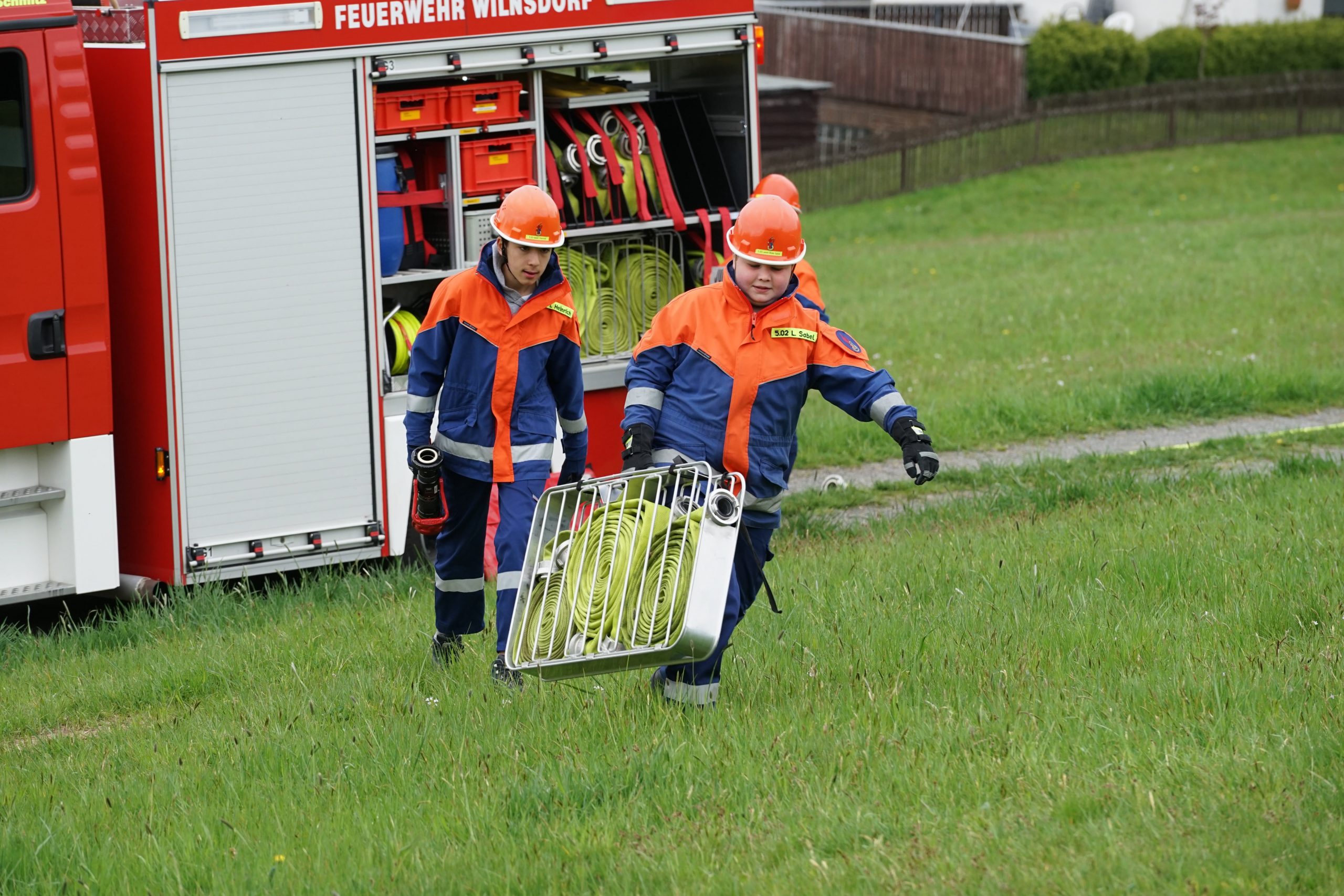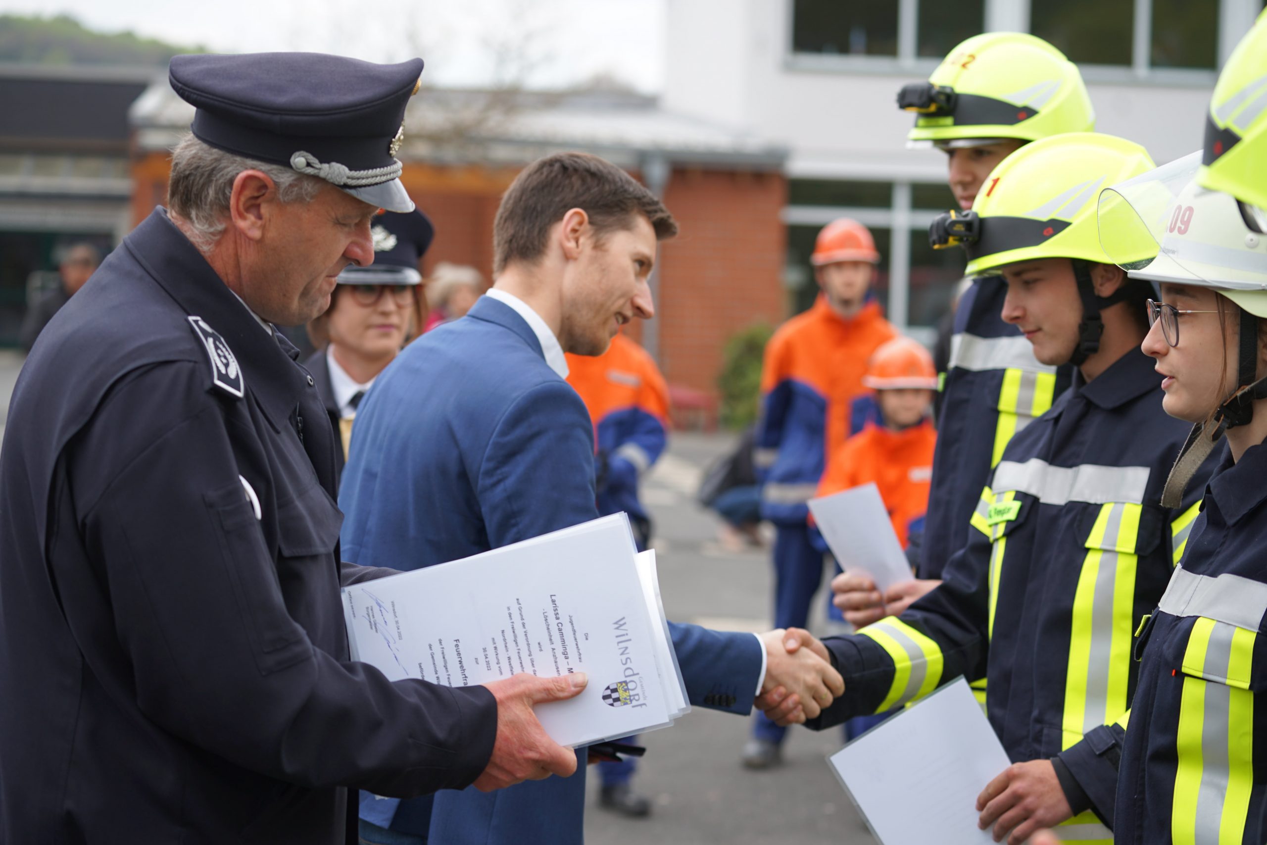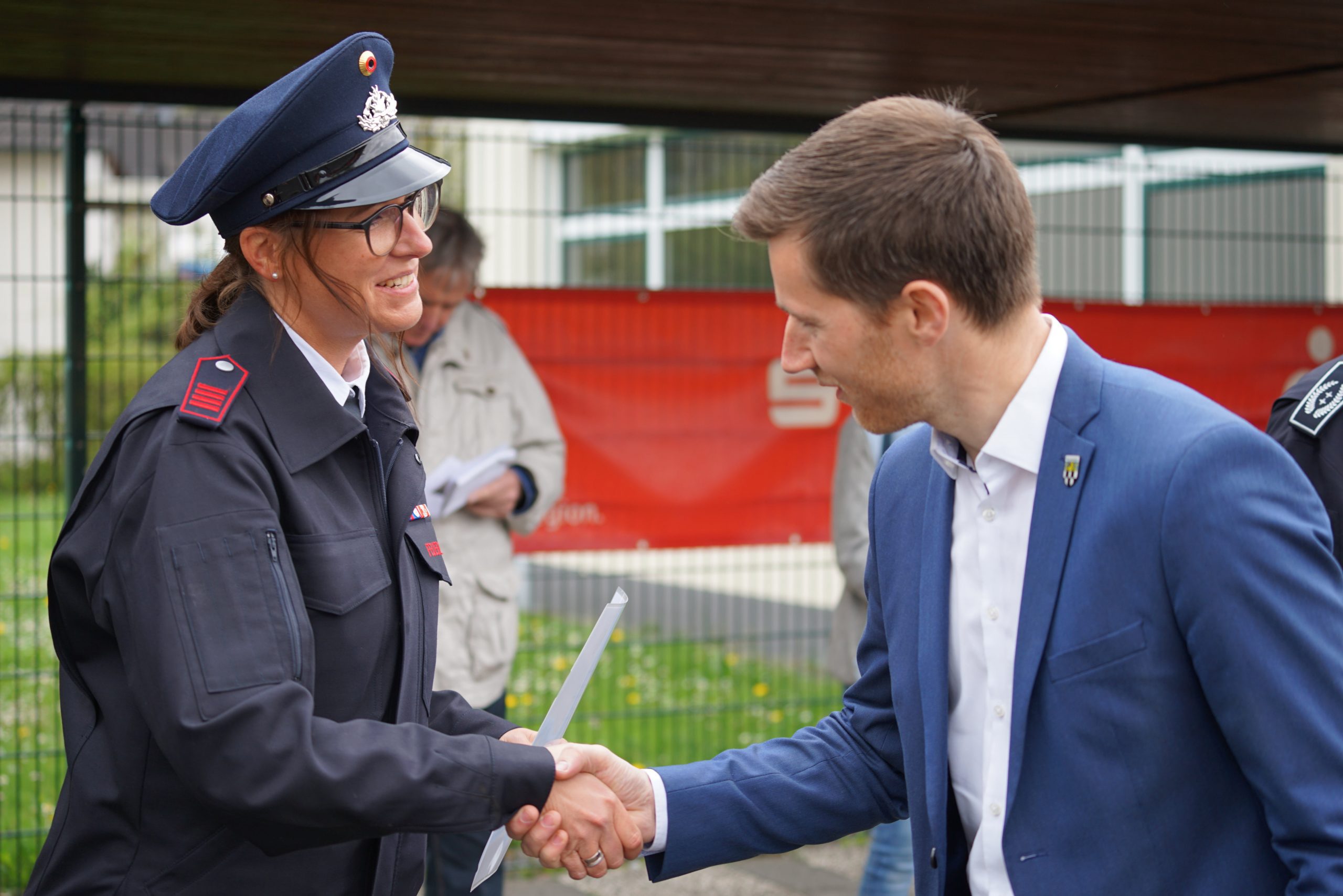 Bevor die Übung richtig starten konnte, galt es noch einige durch Corona aufgeschobene Formalien zu erledigen. Gemeindebrandinspektor Christian Rogalski überreichte gemeinsam mit Bürgermeister Hannes Gieseler an mehrere junge Kameradinnen und Kameraden die offiziellen Urkunden für die Übernahme in den aktiven Feuerwehrdienst. Nico Neef, Patricia Velten, Phil Radicke, Sapha Baraksai, Luka Jakobs, Gideon Baldur Fengler, Larissa Caminga-Meyer, Fynn-Noah Syndicus, Jan-Luca Syndicus und Vanessa Wagner sind nun ganz offiziell Feuerwehrfrauen beziehungsweise Feuerwehrmänner. Mit der Kameradin Katja Hartmann stand eine weitere Beförderung auf dem Programm. Sie wurde zur stellvertretenden Gemeindejugendfeuerwehrwartin ernannt.