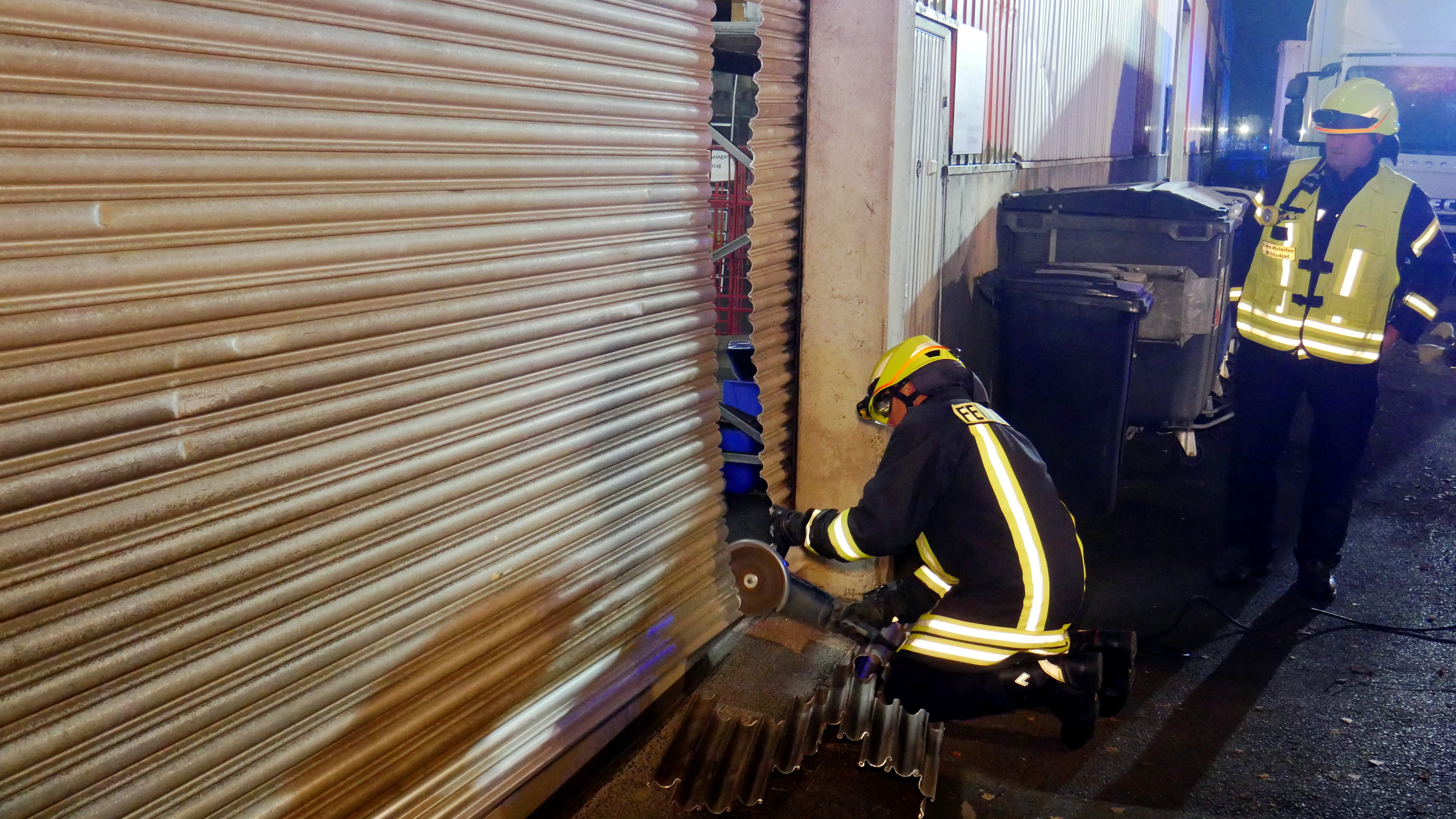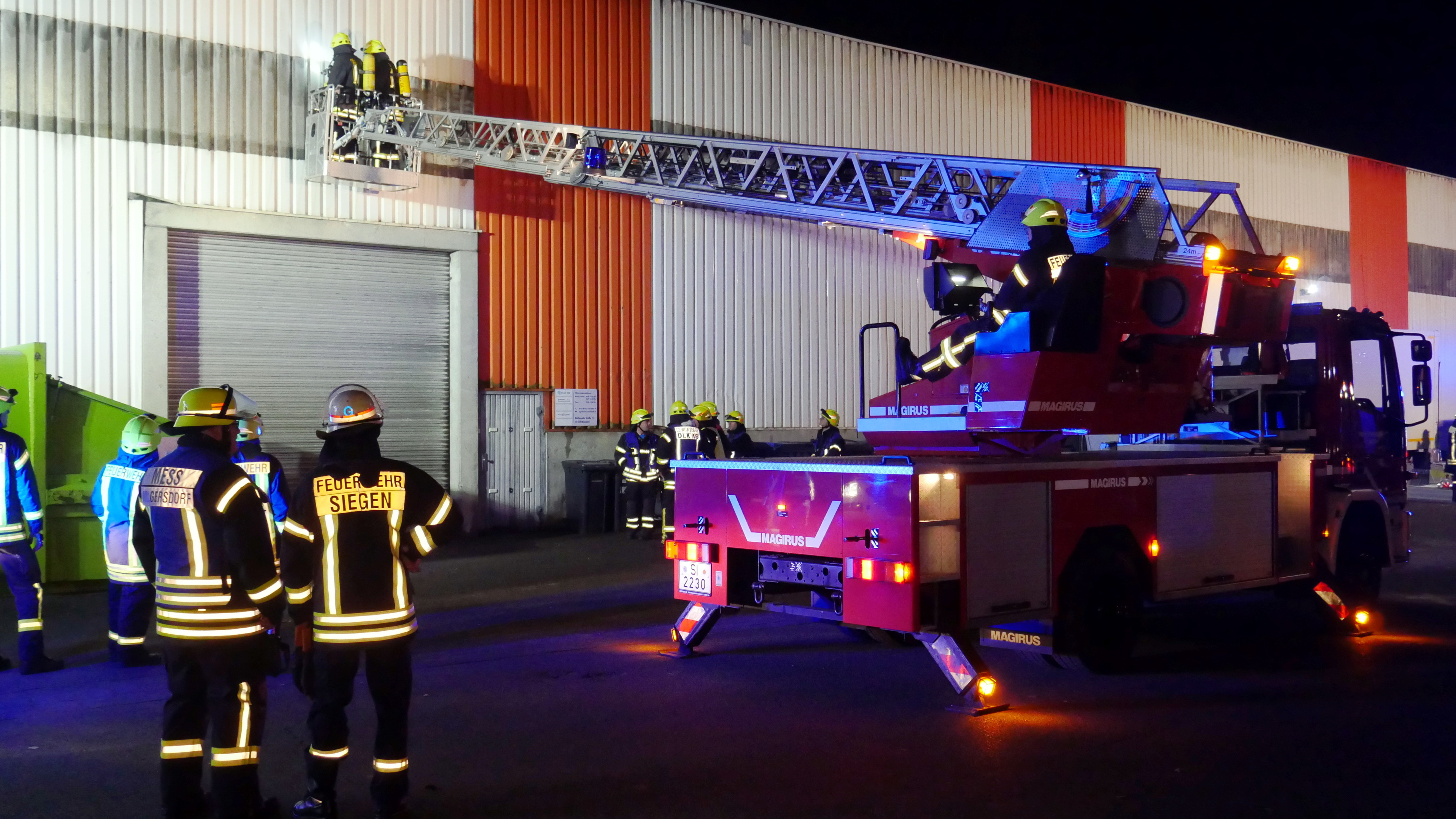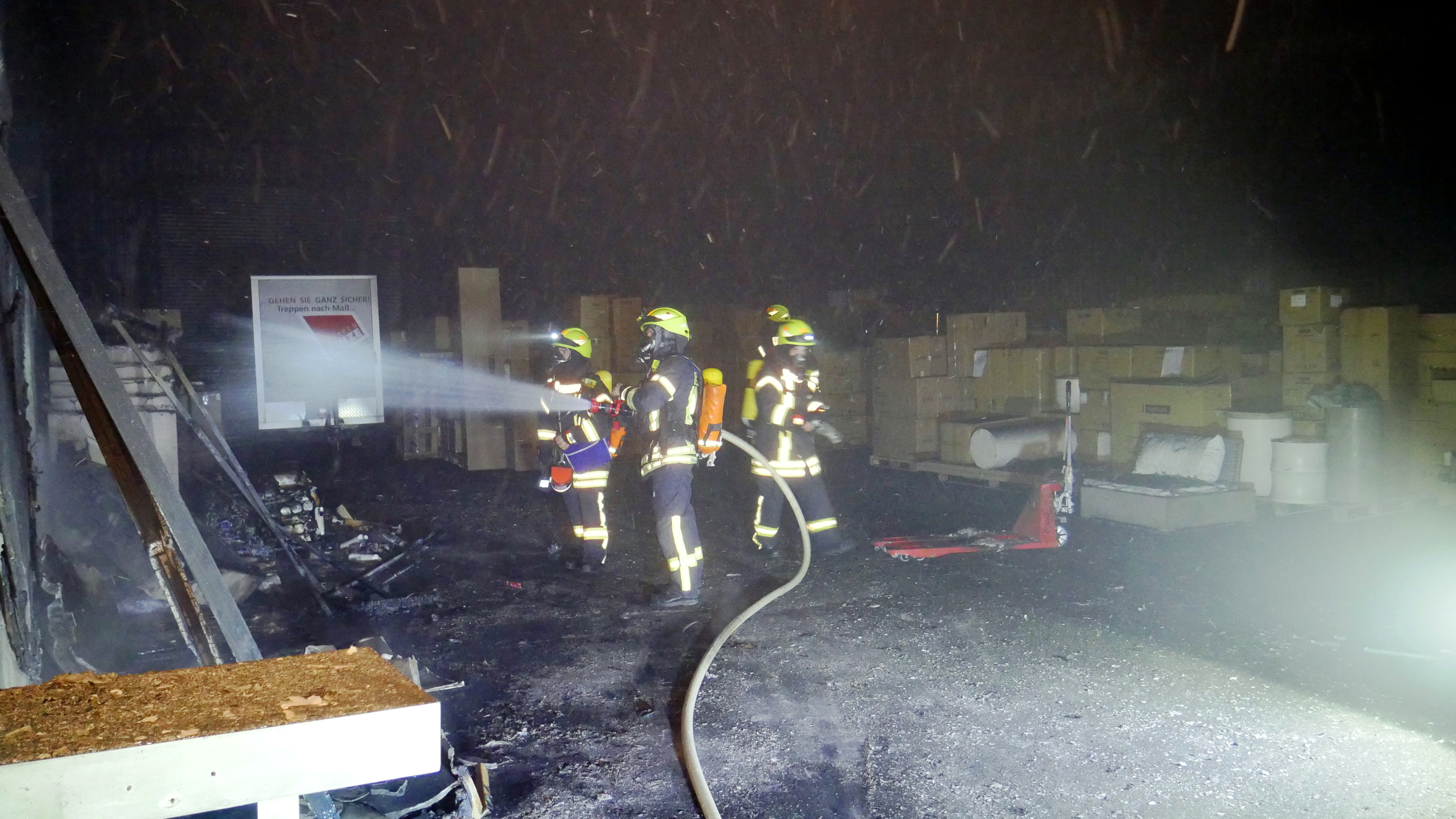 Am Mittwochmorgen gegen 5 Uhr wurden Feuerwehr und Rettungsdienst zu einem Brand im Wilnsdorfer Industriegebiet Lehnscheid alarmiert. Das Einsatzstichwort „Feuer 5 – Hallenbrand“ ließ Schlimmes befürchten. Nach Eintreffen der ersten Feuerwehrkräfte am Einsatzort in der Dortmunder Straße, es handelte sich um einen von mehreren Unternehmen genutzten Lagerhallenkomplex, musste zunächst die Lage erkundet werden, da kein offensichtliches Feuer zu entdecken war. Nach kurzer Zeit konnte der Brandort ermittelt werden. Hierzu musste sich die Feuerwehr gewaltsam Zugang zu einer der Hallen verschaffen. Im Inneren des Gebäudes war eine Holzpalette mit darauf befindlichem Gut aus bislang ungeklärter Ursache in Brand geraten – das Feuer war größtenteils von selbst erloschen. Um auf Nummer sicher zu gehen wurden die restlichen Glutnester abgelöscht. Durch die bei dem Brand entstandene enorme Rauchentwicklung mussten die Hallen mittels Lüftern vom Rauch befreit werden. Über die Höhe des entstandenen Sachschadens können noch keine Angaben gemacht werden, da zunächst festgestellt werden muss, welche der gelagerten Dinge durch den Brandrauch geschädigt wurden.