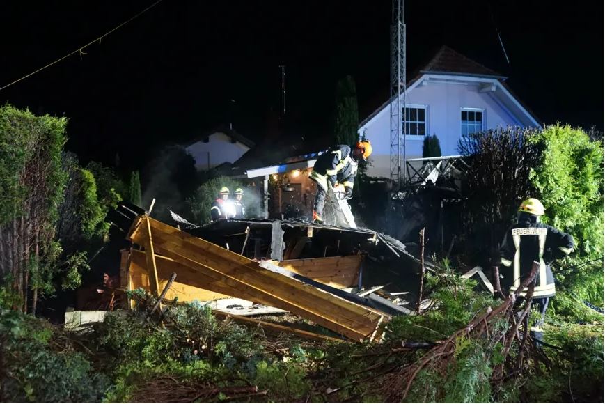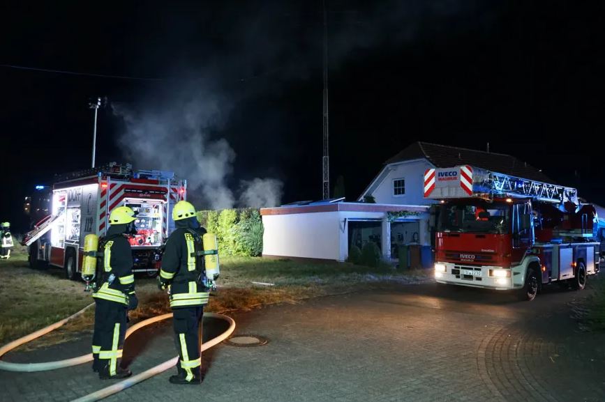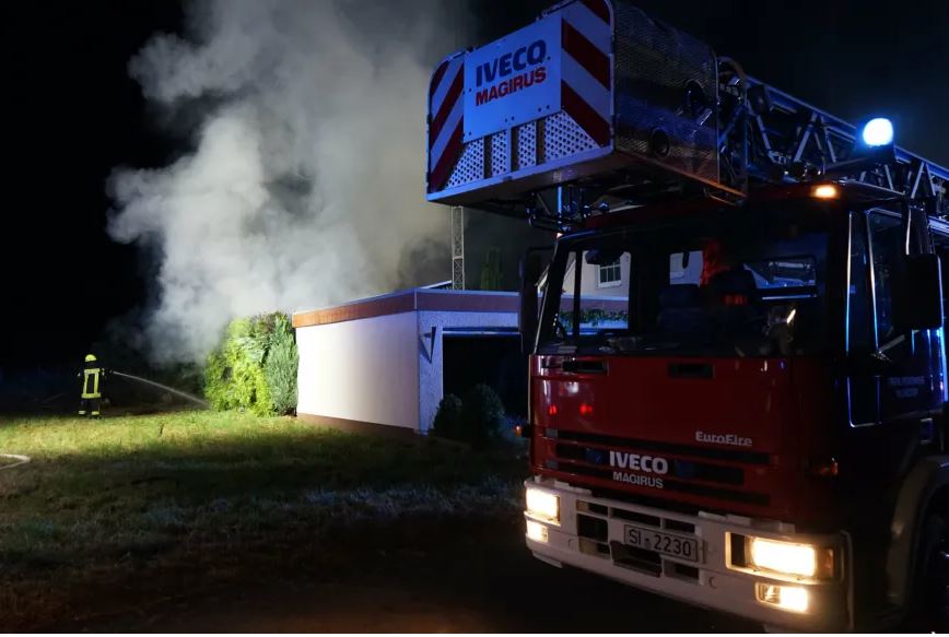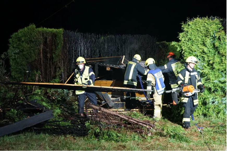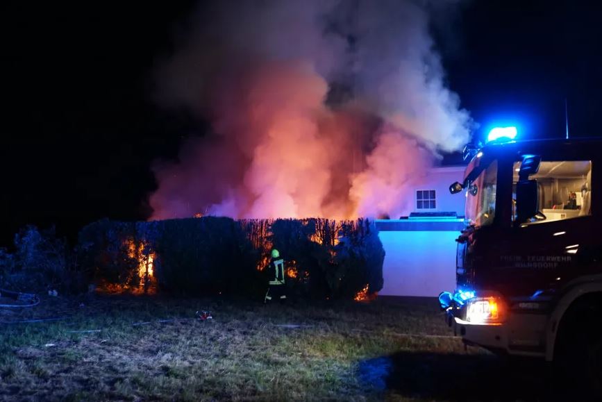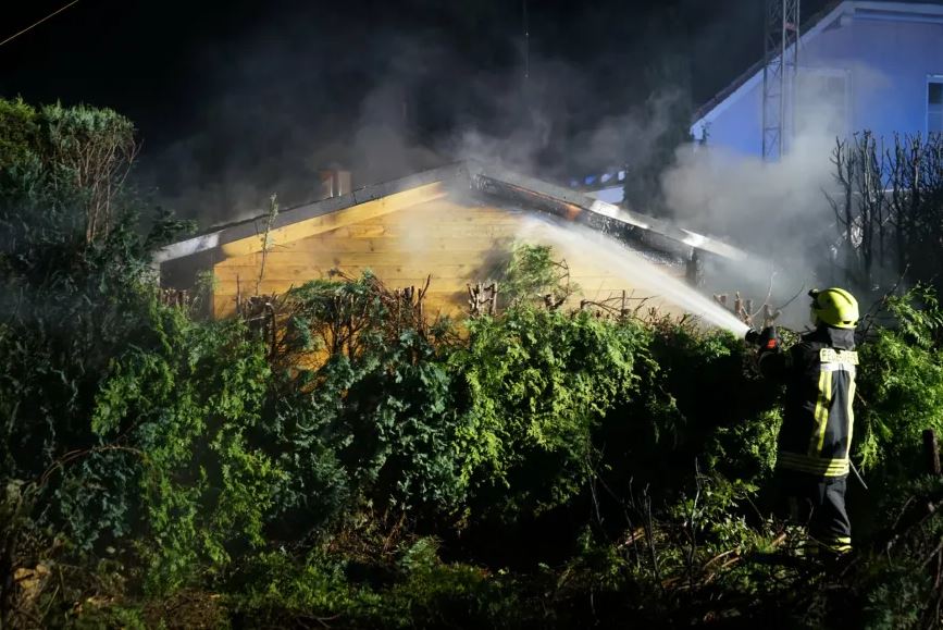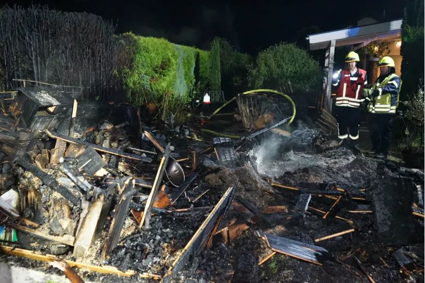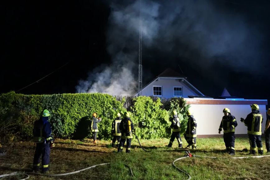 Schon bei der Anfahrt der Feuerwehrleute wiesen hell lodernde Flammen den Weg zum Einsatzort. Vor Ort eingetroffen war nach erster Erkundung die Lage schnell klar: eine hinter einem Wohnhaus stehende Gartenhütte und ein kleiner Hühnerstall standen im Vollbrand. Flammen hatten bereits auf eine angrenzende Hecke übergegriffen. Die beiden Hausbewohner konnten das Gebäude zuvor unversehrt verlassen.
