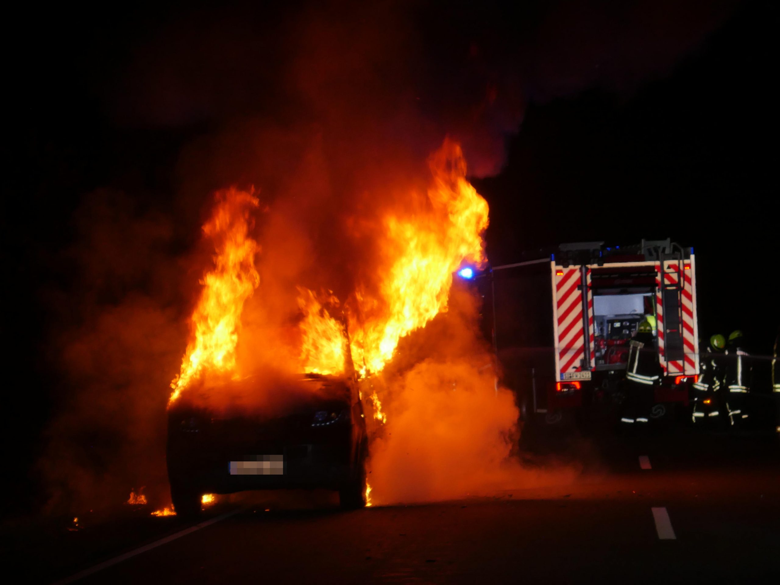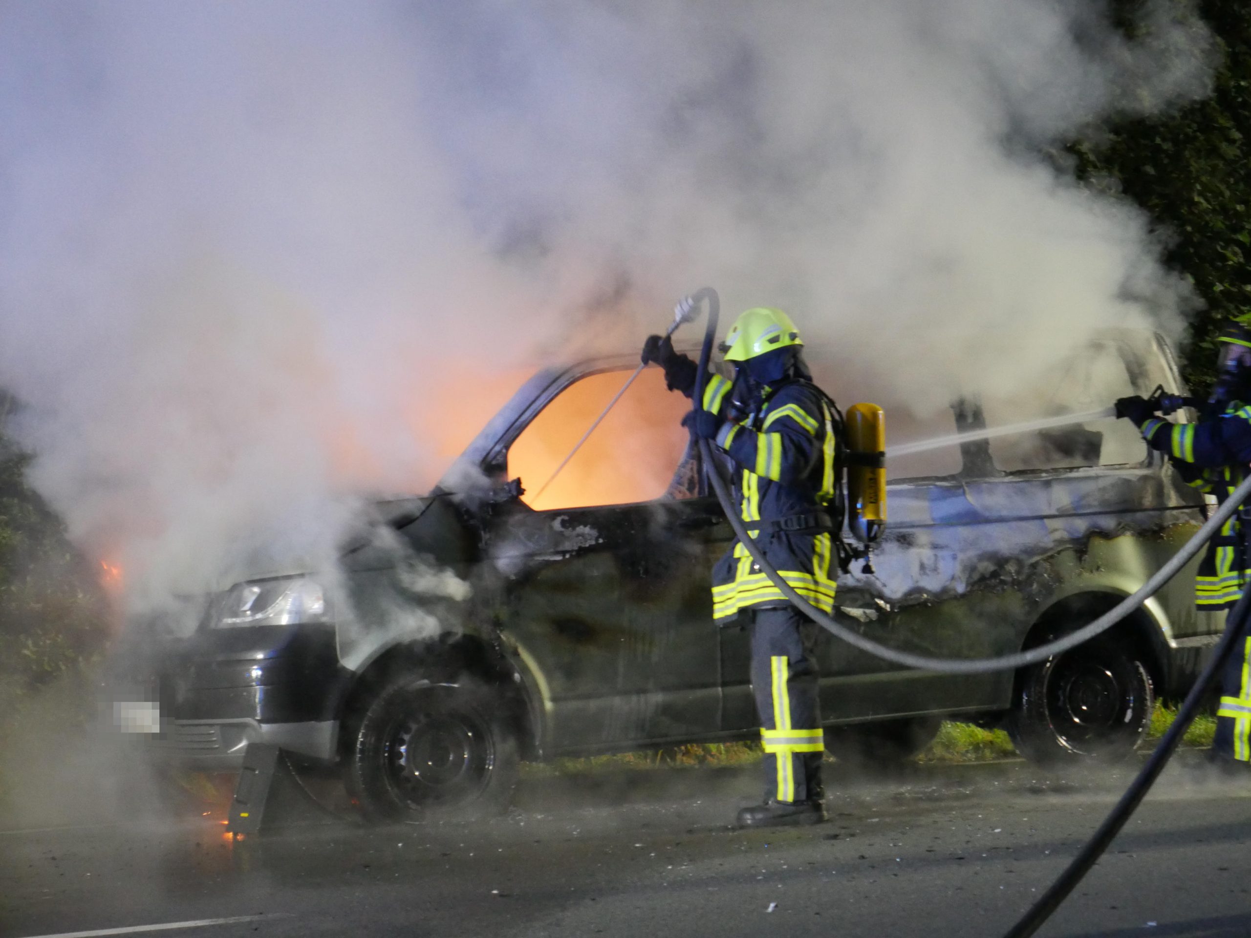 Für drei Insassen eines VW.Bus nahm am Donnerstag gegen 21 Uhr eine abendliche Fahrt ein jähes Ende. Sie befuhren die B 54 von Haiger kommend in Richtung Wilnsdorf. Kurz hinter einer Bergkuppe, dem höchsten Punkt der Kalteiche, bemerkte der Fahrer ein Qualmen aus dem Heckbereich des Fahrzeuges. Er hielt umgehend am Straßenrand an, alle drei Insassen verließen den Wagen. Kurz darauf stand bereits der komplette Bus im Vollbrand. Die angerückten Einsatzkräfte der Feuerwehr konnten der Flammen schnell Herr werden, ein Totalschaden an dem Fahrzeug war jedoch nicht mehr zu verhindern. Brandursache dürfte laut Polizei ein technischer Defekt sein. Es liegt der Verdacht nahe, dass eine im Heckbereich des Wagens verbaute Standheizung der Auslöser gewesen sein könnte.