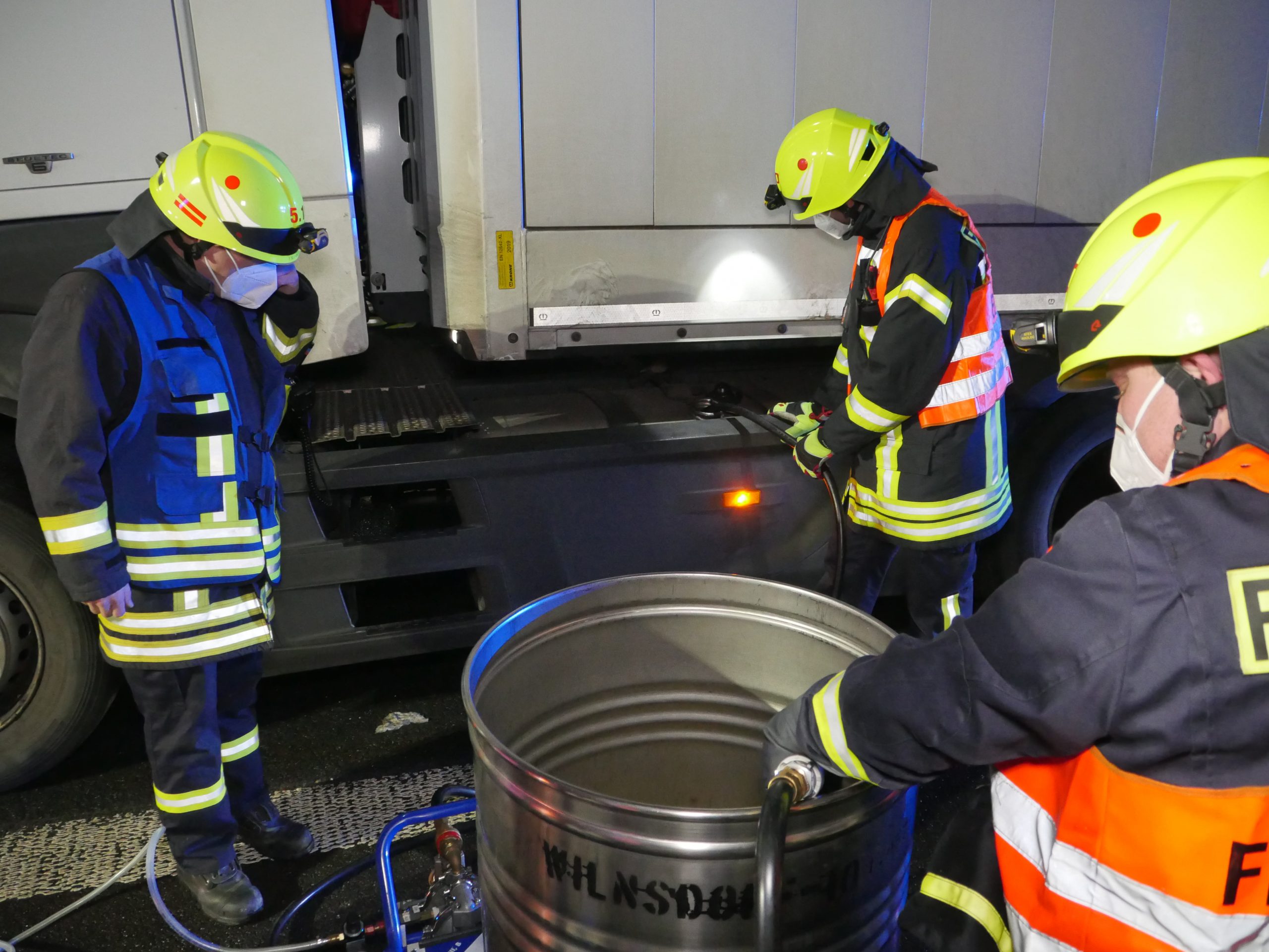 Der 27-jährige Fahrer eines Sattelzuges war von Süden kommend in Richtung Dortmund unterwegs. Im Bereich der Brückenbaustelle der Talbrücke Eisern kam der Trucker aus bislang ungeklärter Ursache nach rechts von der Fahrbahn ab und kollidierte mit der seitlichen Baustellenabsperrung. Hierbei wurden der vordere Bereich der Zugmaschine und der Treibstofftank beschädigt – Dieselkraftstoff lief aus. Der 27-Jährige fuhr noch wenige hundert Meter weiter und stellte sein Fahrzeug kurz vor der Anschlussstelle Siegen-Eisern im Abfahrtsbereich ab. Der Fahrer blieb unverletzt und kam mit dem Schrecken davon. Die an der Unfallstelle angerückten Feuerwehrkräfte pumpten den restlichen in den Dieseltanks des Lkw befindlichen Kraftstoff ab. Die Wilnsdorfer Feuerwehrkräfte übernahmen federführend den Einsatz, sodass die Kameraden aus Eisern nach kurzer Zeit wieder abrücken konnten.