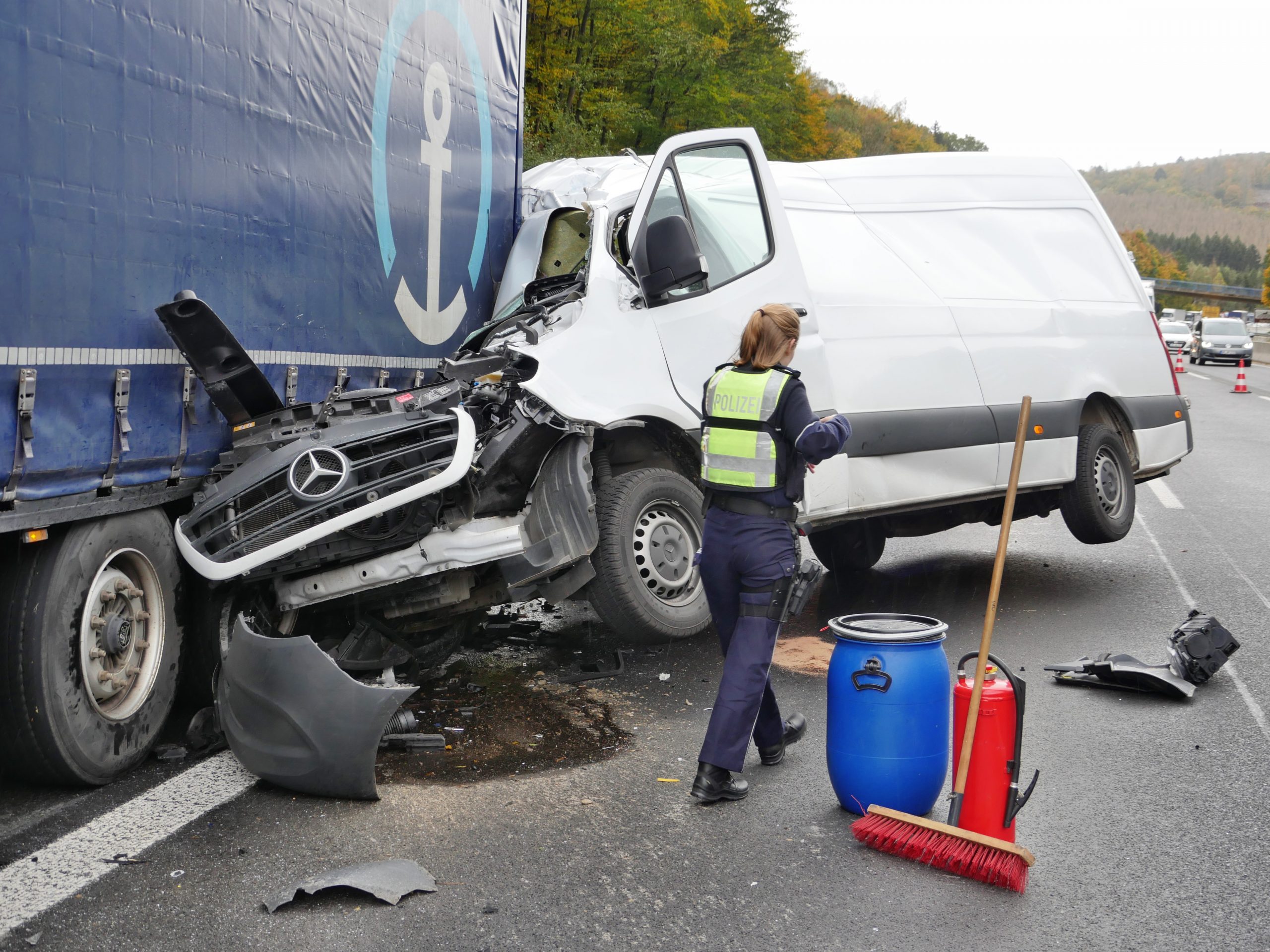 Auf Grund einer Panne hatte ein 42-jähriger Fahrer seinen Sattelzug zwischen den Anschlussstellen Wilnsdorf und Haiger-Burbach auf dem Seitenstreifen der Sauerlandlinie abgestellt. Als ein 37-jähriger Fahrer eines Kleintransporters den Lastwagen passierte wurde sein Fahrzeug von einer Windböe erfasst und gegen den Pannenlastwagen gedrückt, so die Angaben der Polizei vor Ort.